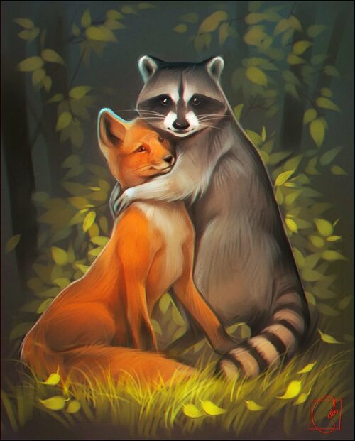 Лиса обнимает енота