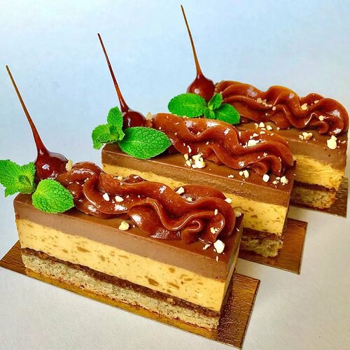 Нарезное пирожное может быть украшено разнообразными декоративными элементами, такими как шоколадные узоры, цветочные композиции, фрукты, ягоды или съедобные кристаллы. Каждое пирожное может иметь свою уникальную начинку - от шоколадного мусса и крема до фруктовых салатов и сырных начинок.