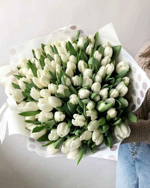 Белые тюльпаны - это символ чистоты, нежности и красоты. Их нежные лепестки и великолепный аромат могут сразить вас наповал. Если вы хотите добавить свежести и элегантности в свой дом или подарить радость близким, большой букет белых тюльпанов - отличный выбор.