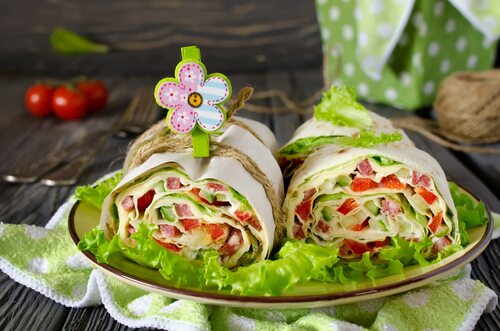 Размажьте гуакамоле на тортилье, добавьте нарезанный помидор, листья салата и кусочки куриного мяса или ветчины. Скрутите тортилью и нарежьте на порционные кусочки. Просто и вкусно!