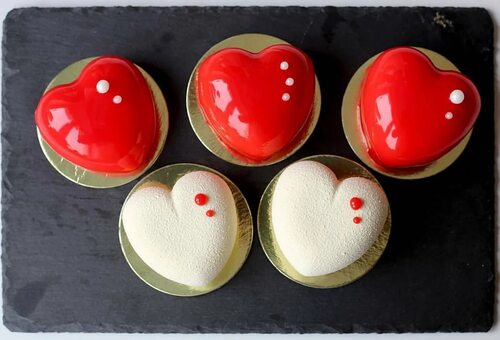 Готовое муссовое пирожное сердце готово к сервировке и угощению гостей. Уверены, что его великолепный вкус и внешний вид покорят сердца всех любителей сладостей!