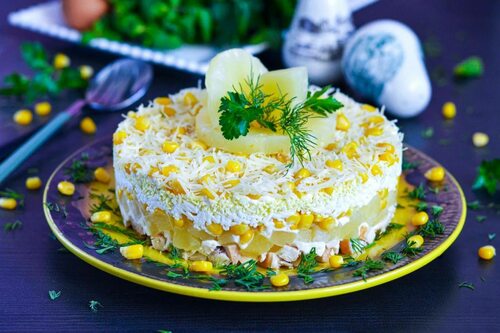 7. Подавать салат с ананасом и курицей с зеленью по желанию.