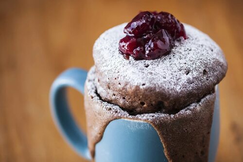 5. Посыпьте кекс пудрой и наслаждайтесь им прямо в кружке, или переложите на тарелку.