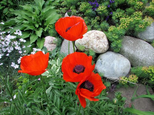 Маки на клумбе с другими цветами