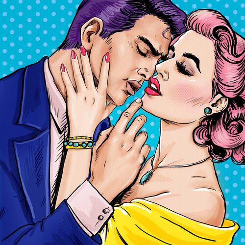 Поп арт влюбленные - это яркий и выразительный стиль искусства, который изображает любовь и романтику с использованием контрастных цветов, графических элементов и преувеличенных форм.