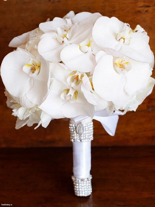 Букет невесты из фаленопсиса также может быть украшен различными элементами, такими как лента, бусины, жемчуг или кристаллы. Это добавит ещё больше изыска и роскоши вашему свадебному образу.